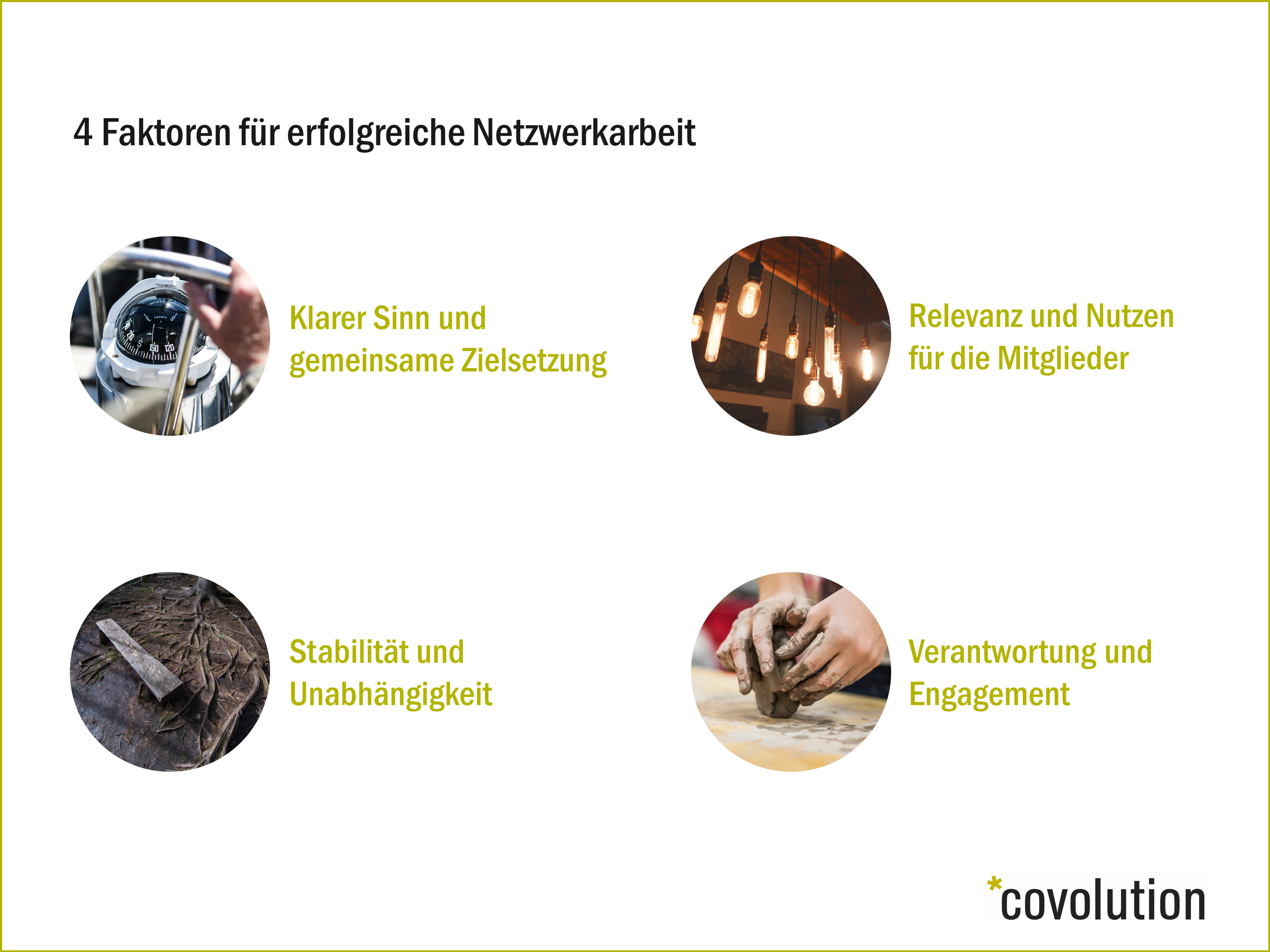 Wir von covolution setzen auf vier Faktoren für erfolgreiche Netzwerksarbeit. Diese dienen Organisationen sowohl als Richtschnur beim Aufbau als auch als Reflexionshilfe für bestehende Netzwerke.