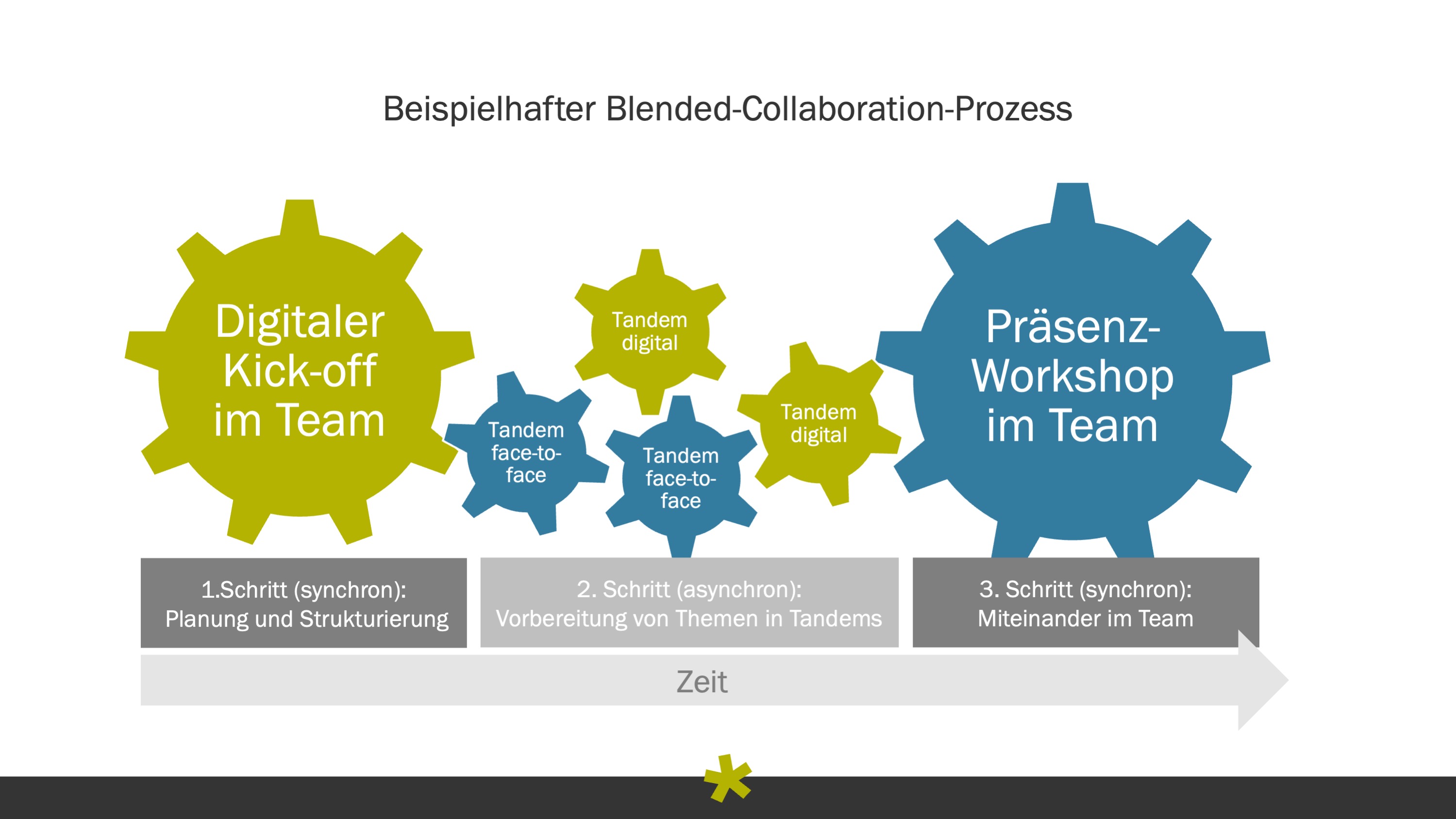 Während vor Corona viele Workshops nur in Präsenz durchgeführt wurden und in Zeiten der Pandemie jegliche Zusammenarbeit im digitalen Raum stattfand, setzt Blended Collaboration auf einen wirkungsvollen Mix aus analog und digital, aus synchroner und asynchroner Zusammenarbeit: