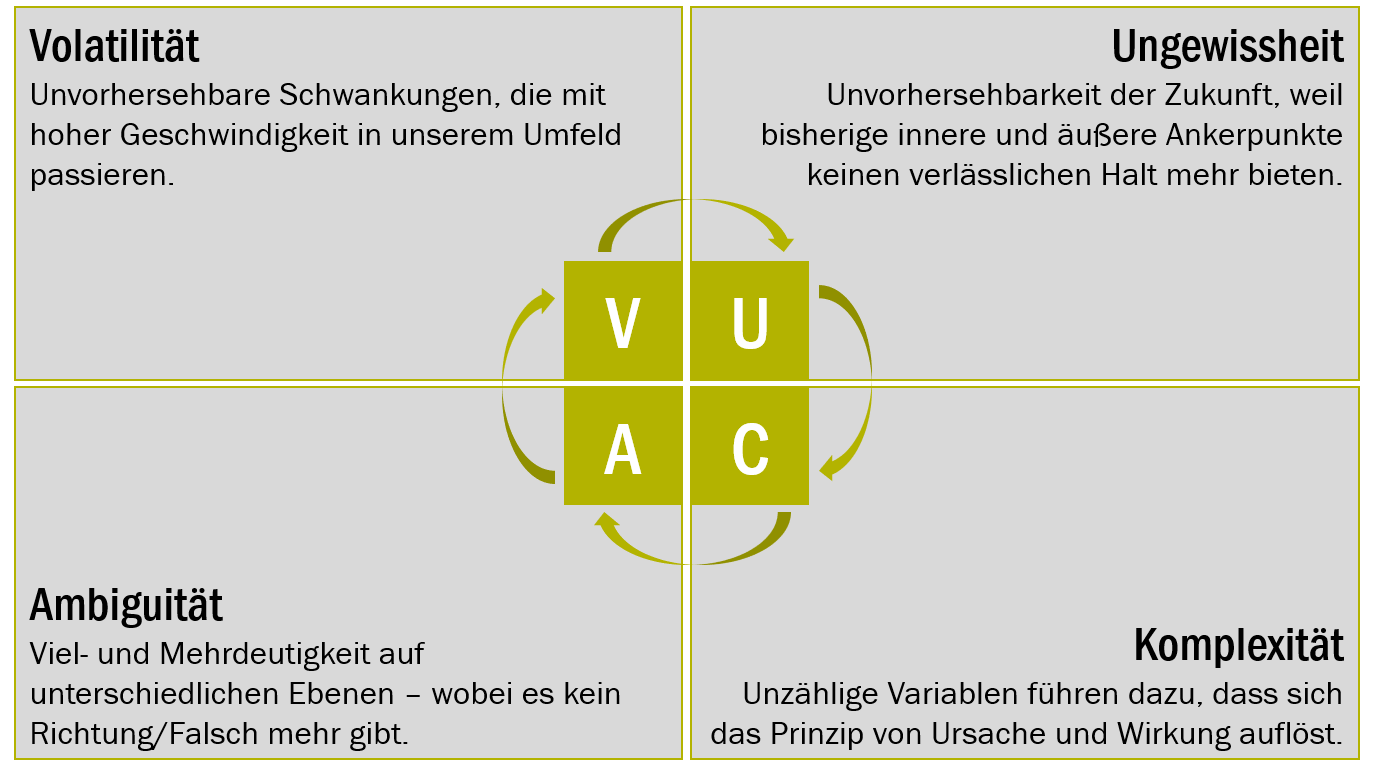 Stille ab. Wir tauchen in die VUCA-Welt uns ihre unterschiedlichen Facetten ein.